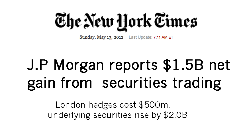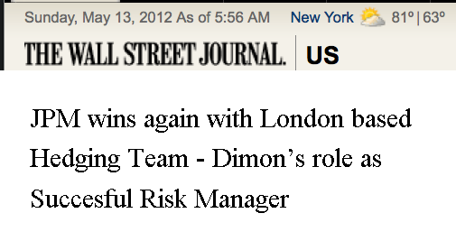 As of today, I’m operating under the assumption that the losses at JPM are the result of hedges that went bad. The original intent was to minimize risk, the result was exactly the opposite. This was not about some rogue trader that hid the risk that was being taken, senior management was (sort of) aware of the “hedging” trades that were put on by the bad folks in London.