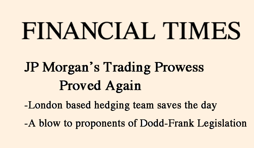 I think that JPM screwed up this critical calculation. They bought some protection in a market that they thought was correlated. It turns out the were right, but they bought too much protection so the hedge losses ended up being greater than the gains from the underlying portfolio. If JPM had hedged with a much smaller exposure to CDX.NA.IG.9 (the derivative contract that done JPM in) the headlines would have been different. We might have gotten these instead: