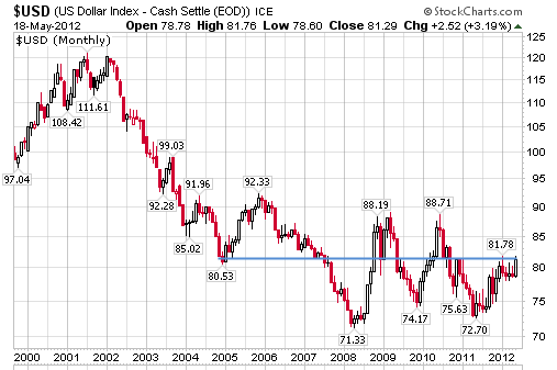 The US$ index is at a spot first touched in late 2004. Gold was well under $500 an ounce at that time, so please do not tell me gold is a function of the US dollar.