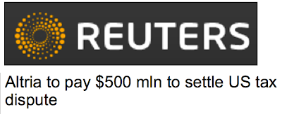 Altria got nailed by the IRS as a result of aggressive tax accounting on leveraged leases it owned. The potential loss could have been $1b. Last year MO took a charge of $627m to cover the cost of a settlement. The deal it cut with the IRS is well under budget.
