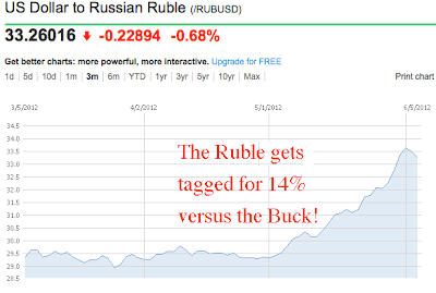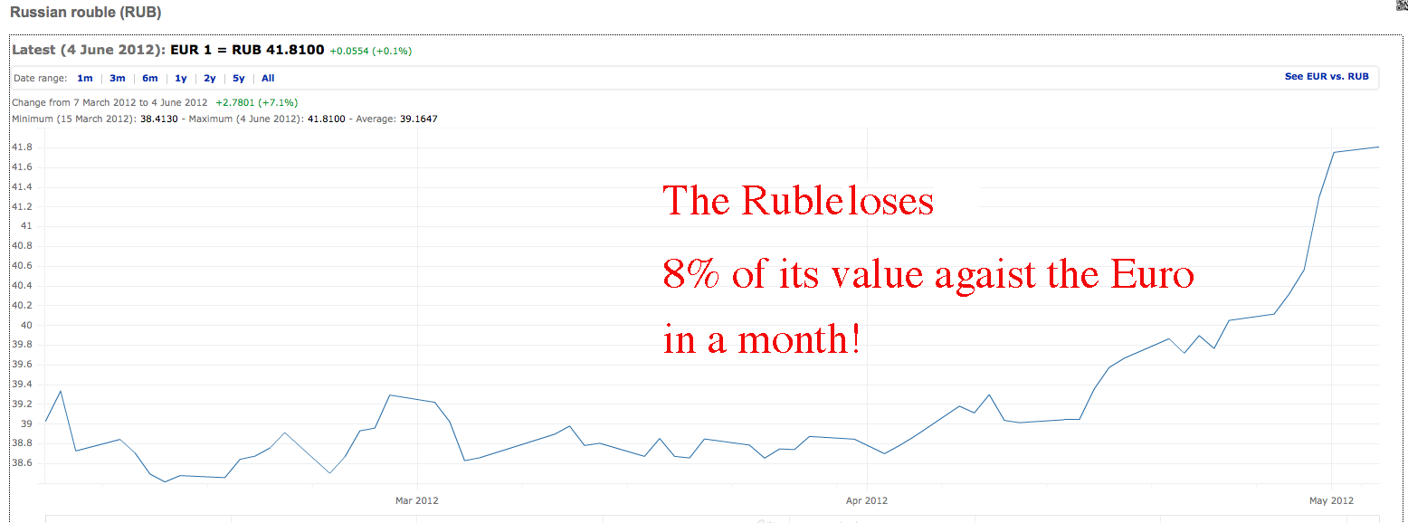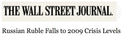 The following looks at the performance of the Russian Ruble versus the dollar the past few months. Not pretty at all:
