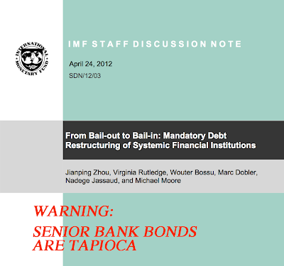 The IMF published a lengthy report on the topic of Senior bank bonds on April 24 (convenient timing). The bottom line conclusion of the IMF? It recommended a “bail-in”, where the senior bondholders of banks get crushed. I found this startling: