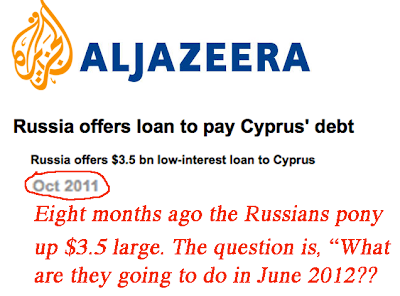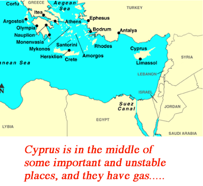 I have to believe that the game of chess I describe is happening at one level or another as I write. Cyprus is strategically too important. My guess is that the deciders in Brussels (and D.C.) will try to keep the Russians out, and keep Cyprus in the EU fold. This would suggest that Cyprus is offered a deal that strays from that offered to Spain. It would have to be far superior to that offered to nearby Greece.