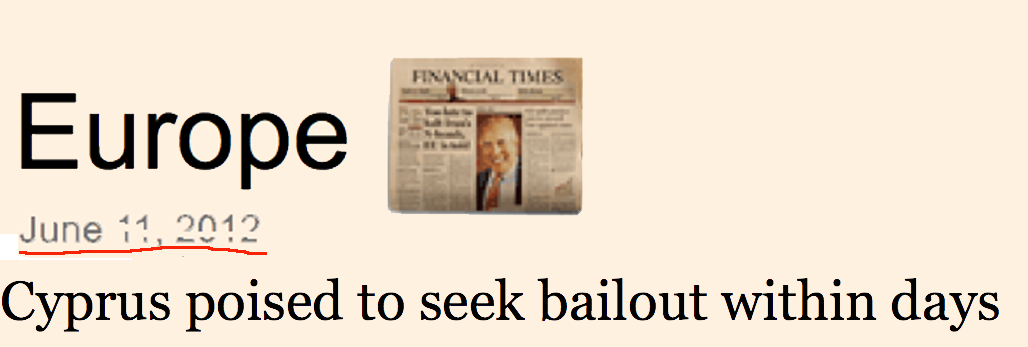 Let me first say that the problems in Cyprus are very small compared to Spain. If it were not for the fact that the rest of Southern Europe is on fire, Cyprus would get a very nice deal from its “friends” in Brussels. I think the country needs about Euro5B to shore ups its banks, another E20B for the Treasury. Chump change these days.