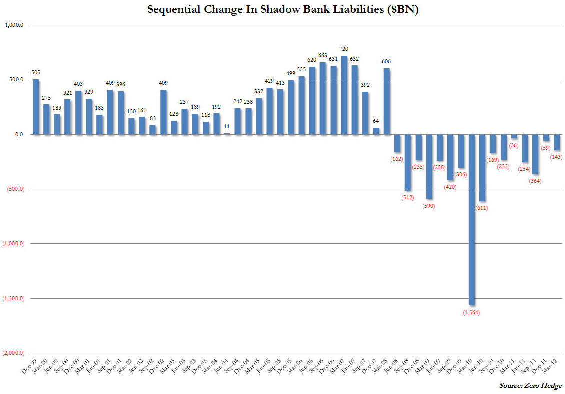 On a similar chart ZH commented … “As another reminder, US Shadow Banking liabilities – a combination of Money Market funds, GSE and Agency paper, Asset-Backed paper, Funding Corporations, Open market paper and of course, Repos – hit a gargantuan $21 trillion in March 2008. They have tumbled ever since, printing at just under $15 trillion at the end of March 2012, the lowest number since March 2005 when shadow banking liabilities were soaring. This is an epic $6 trillion in flow being taken out of credit-money circulation, with a $143 billion drop in Q1 alone!”