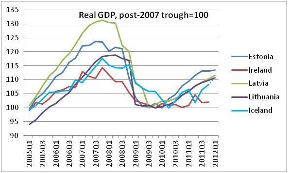 "….the Baltic economies remain substantially poorer than Iceland and most euro-zone members and should therefore be expected to have a much faster rate of underlying growth thanks to the potential for catch-up. That they've essentially kept pace with rich Iceland rather than catching up points to the advantage of adjustment via devaluation, as does Iceland's good performance relative to Ireland."