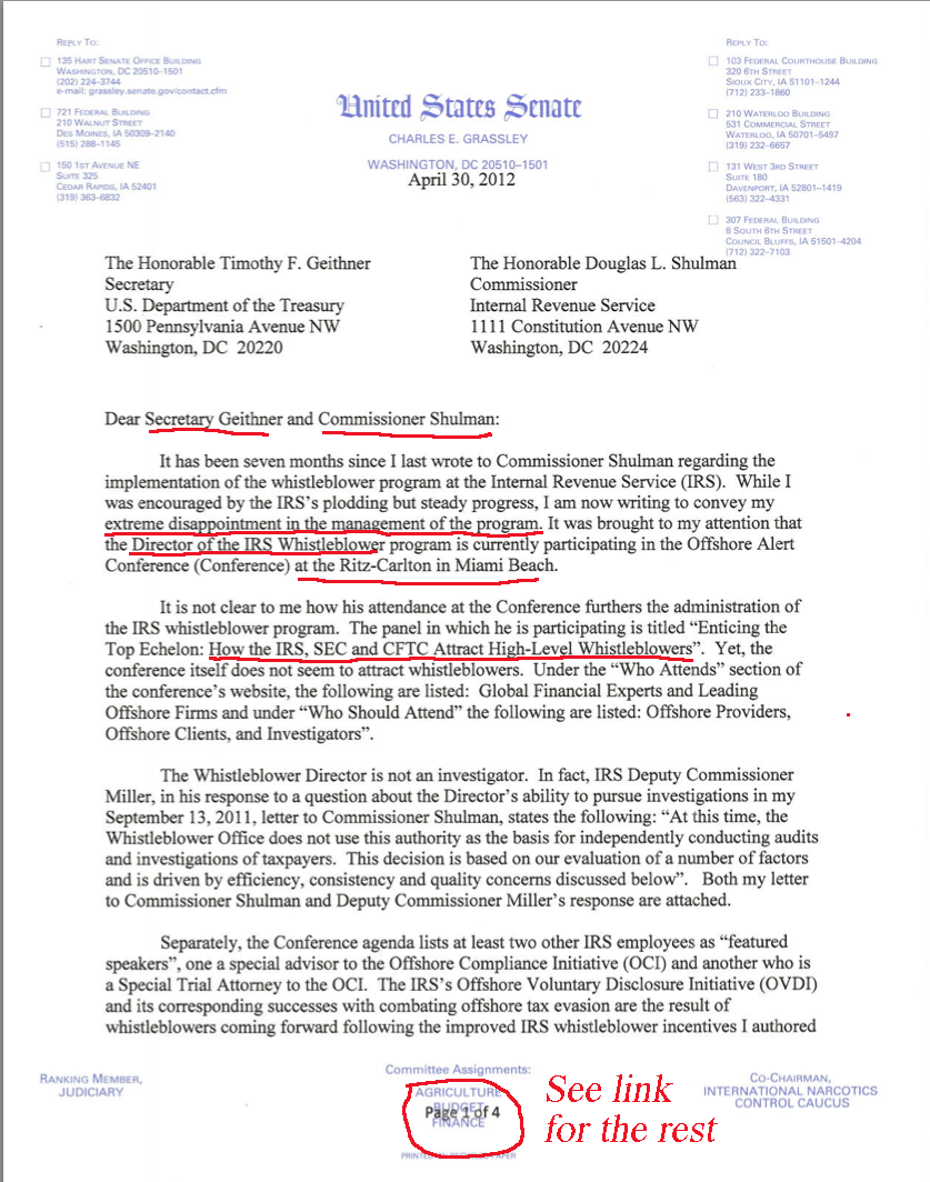 One powerful US Senator is doing his best to light a fire under the IRS. Senator Grassely (R. – IO) wrote the following letter (link: PDF) to the IRS Commissioner in an effort to bust some folks and collect some dough.