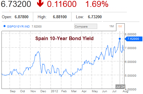Yield on 10-year Spanish bonds remains stubbornly high near 7%, but yield on 2-year bonds is in the midst of a breathtaking crash.
