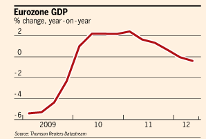 Eurozone GDP sunk .2% in the second quarter and is clearly back in recession as a whole. For that matter, the eurozone has been in recession all year if not starting in the final quarter of 2011. Thus I am amused by headlines such as this one from the Financial Times: Eurozone edges back towards recession