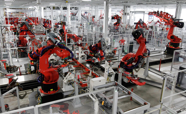 While the many robots in auto factories typically perform only one function, in the new Tesla factory in Fremont, Calif., a robot might do up to four: welding, riveting, bonding and installing a component.