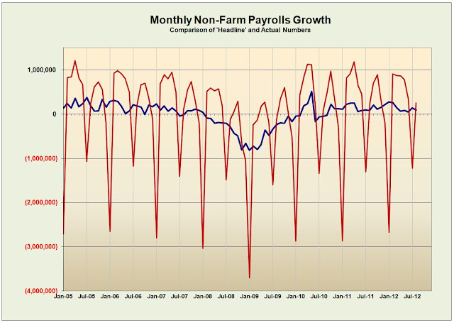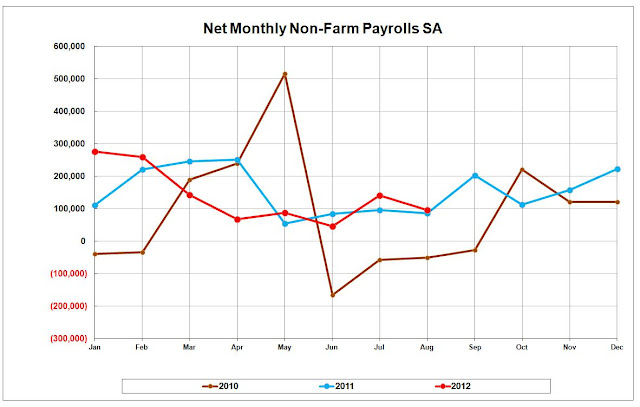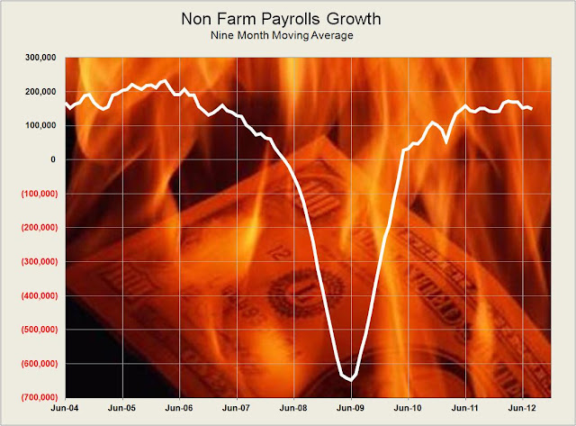 The unemployment rate is a fairly useless measure, as it continues to improve by dropping people from the labor force. The Labor Participation Rate is much more relevent. This shows a continuing decline to the lowest level in three decades.
