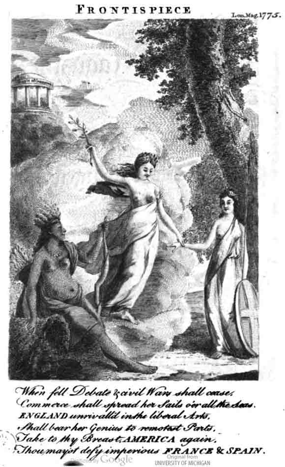 Illustration: An engraving from The London Magazine, January 1775, showing the Goddess of Peace bringing an olive branch to America and Britannia.