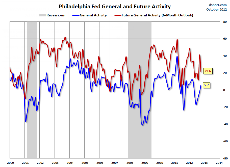 Doug Short at Advisor Perspectives has an interesting series of Philly Fed Charts. For example, here is a graph of current vs future expectations.