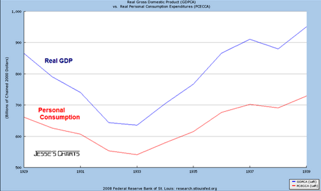 Personal Consumption along with Government Program spending and the currency devaluation were obviously factors to the real recovery in GDP especially since it did not come from net exports. As can be seen from other slides in this series the dip in GDP in 1938 was due to the Fed's draining reserves by increasing bank reserve requirements out of a misplaced fear of inflation.
