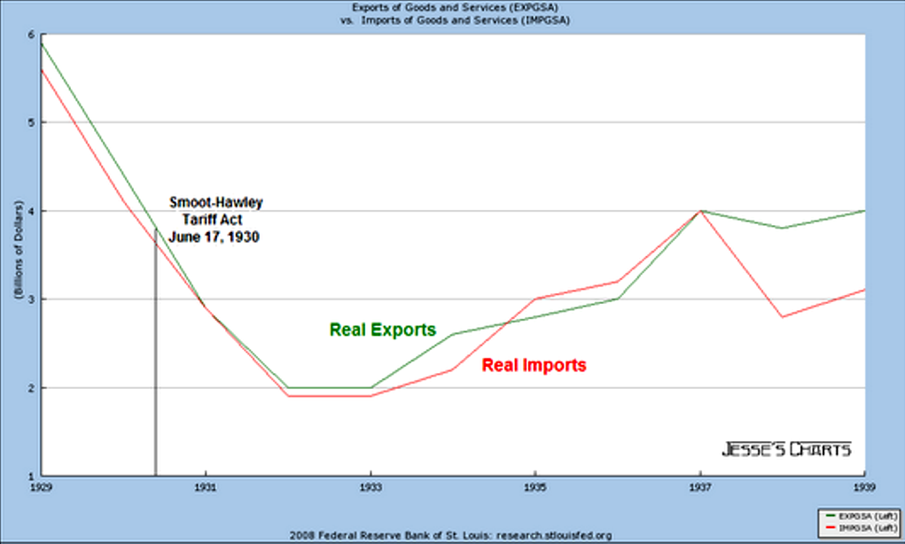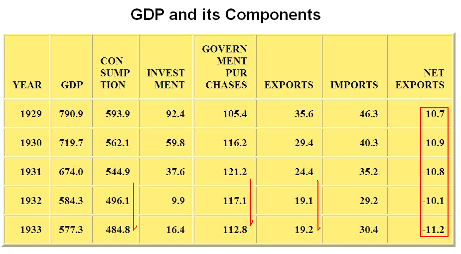 The Smoot-Hawley Tariff was enacted on 17 June 1930. Exports had already been plunging before that because when demand goes slack in a deep recession both imports and exports tend to drop with demand. I think some of the rhetoric surrounding the issue of global trade in this case is nonsense. In the Great Depression tariffs did not matter because no one was really standing as the buyer of last resort. And if the tariffs went into effect in the middle of 1930, they certainly did not have an untoward impact on imports relative to the plunge in exports, again due to prevailing economic conditions. Notice that net exports remain largely flat throughout the period. To state this more precisely, the negative effects of Smoot-Hawley are vastly overstated by globalist advocates.