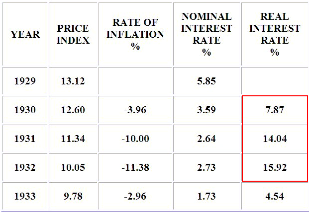 Look at those real interest rates. No wonder the country almost ground to a standstill. The Fed and the Hoover Administration, particularly Treasury Secretary Mellon, ought to have been ashamed of this policy error. The action of Roosevelt in 1933 in breaking the dollar against gold and recapitalizing the banks after shutting down the weak ones, and substantial investigation and reforms, did the trick.