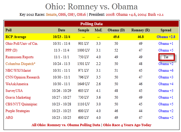 The Real Clear Politics average projection is that Obama will carry Ohio by 2.8 percentage points. That is within the margin of error of the polls so the media calls Ohio a tossup. …