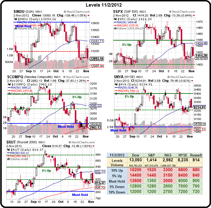 That's where we were at 9:48 Friday morning but it was downhill all day from there and we ended up failing all of our weak bounce levels except fr the NYSE, which is barely over at 8,235.  In the bigger picture, we need to hold those Must Hold lines on the S&P (1,360), NYSE (8,000) and Russell (800) with the Russell closest to failure at 814.  Just like we needed all 5 indexes to bounce to get bullish – we need all 5 indexes to fail to get bearish – otherwise, we're simply playing a fairly narrow 5% range while we wait for the market to decide which way to go.