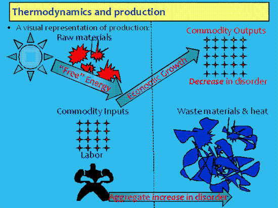 The only way to reconcile production with the second law is that production involves a localised reduction in disorder in the goods and services we generate, which is more than countered by an increase in disorder via the waste outputs from production. Figure one gives a visual representation of this process – and 'free' energy, energy not produced by humans but nascent in the universe itself – plays a crucial role.