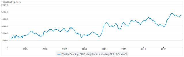 But here is the kicker, on September 30, 2011 Cushing had just under 30 million barrels in storage, as of last week Cushing has 46 million barrels stored at this location, this is an increase of 16 million barrels in one year, if we have a repeat in 2013, which all signs point to as the trend is getting stronger not weaker, than Cushing will be running out of working storage capacity of just over 60 million barrels. I am sure Cushing is building more workable storage capacity as we speak, but at some level what is the point, 2013 is when WTI starts really pricing in some of this supply glut that comes from increased US and Canadian production.