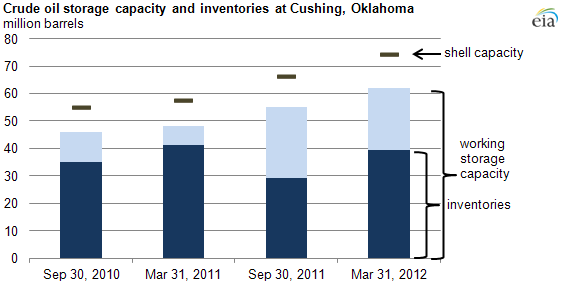 The only reason Oil isn`t much lower currently is that there has been a lot of increased Oil storage for newly built capacity in China and the US. For example, Cushing Oklahoma which is the location that the WTI Futures contract is based upon, had a storage capacity of approximately 47 million barrels in March 2011, with increased Capacity upgrades it stands just above 60 million barrels as of March of 2012.