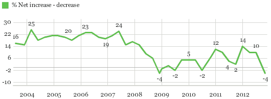 Historically, net hiring intentions have tended to be very positive, with small-business owners expecting to grow and hire more new employees than they will let go over the next 12 months. In good economic years, net hiring intentions have been in the double-digits. This has not been the case since the recession and financial crisis in 2008-2009 with net hiring intentions reaching a low of -4 in November 2008. There was considerable improvement in small-business owners' hiring expectations during much of 2012, prior to the recent November plunge, but now expectations have deteriorated to tie the low recorded in 2008.