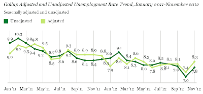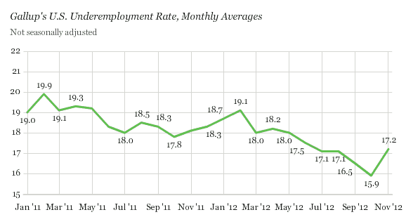 Gallup’s seasonally adjusted unemployment rate is 8.3% for November, up nearly one percentage-point over October’s rate. Gallup’s underemployment jumped from 15.9% to 17.2%.