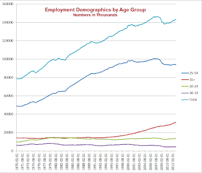 Note that 100% of the job growth since the recession is in age group 55 and over.