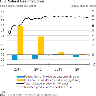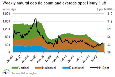 Production has been rising despite a 46% drop of gas rig count during 2012 — According to Baker Hughes, the natural gas rig count was 434 as of January 11, 2012, vs. 811 at the start of 2012. Natural gas working inventories already hit a record-high level in early November, and the EIA now expects natural gas consumption to stay relatively flat year-over-year in 2013 with continued production growth.