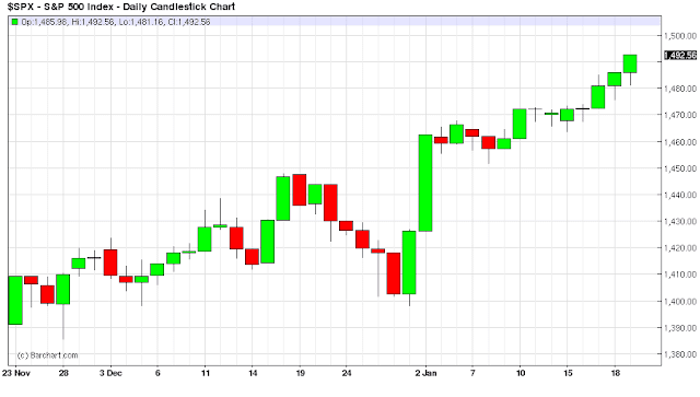 The S&P will be up around 5% just in January alone, not to mention the run-up from about this time last earning`s cycle when the benchmarks all sold off during the second half of earning for the third quarter. Tomorrow is close enough as good as it gets for a while, and traders will try to push up the S&P to 1500 if they can, but the smart money has such large positions that they will start selling into any rally tomorrow, watch for redistribution going on in your favorite stock. The smart money will be handing off to the bag holders looking to get in at the last moment. The smart money never chases, they always wait for a pullback to get into a trending market.