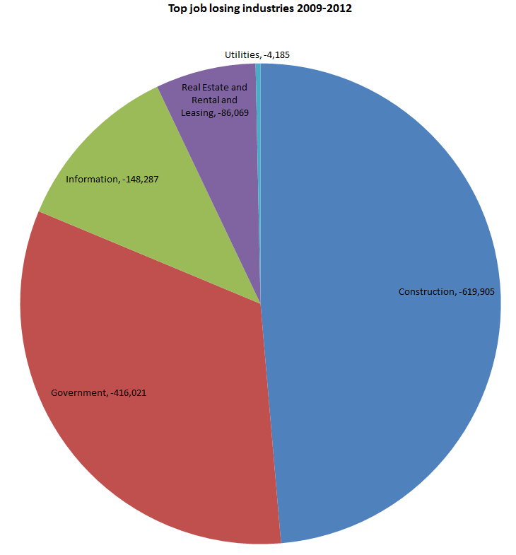 The second article Job Gaining and Job Losing Industries 2007-2012 displayed data in an interesting pie chart fashion by Salil Mehta who has a blog on Statistical Ideas.