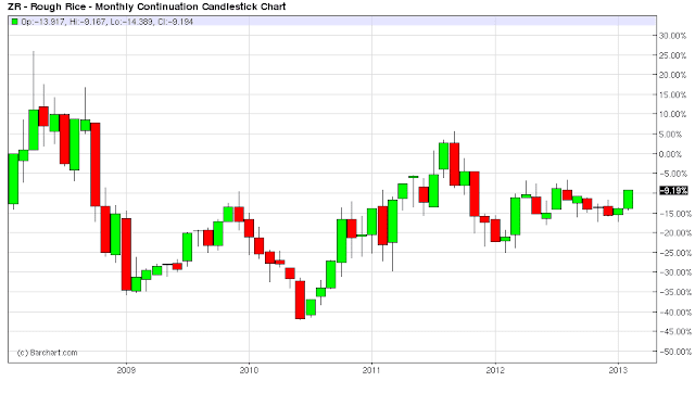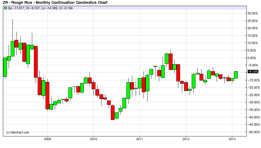 If we take Rough Rice which closed at $16.34 per cwt. it is well below the highs of $22.65 and $19.02 per cwt. established in April 2008 and September 2011 respectively. Sure there is a general trend higher in Rough Rice if we go back to 2003, but how actively traded was the instrument back then from an overall investment standpoint? However, the bigger picture of the last five years shows no real signs of inflation for a major food staple in the world`s diet.