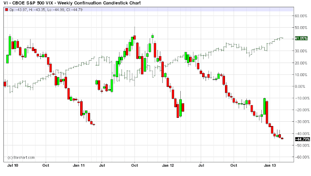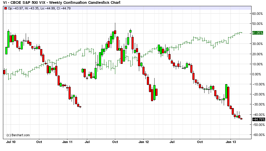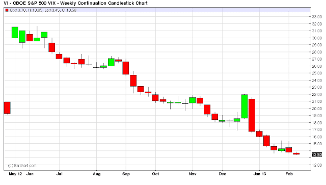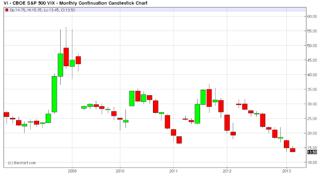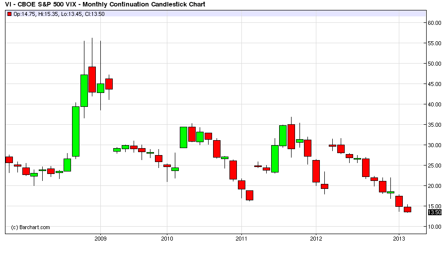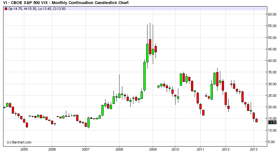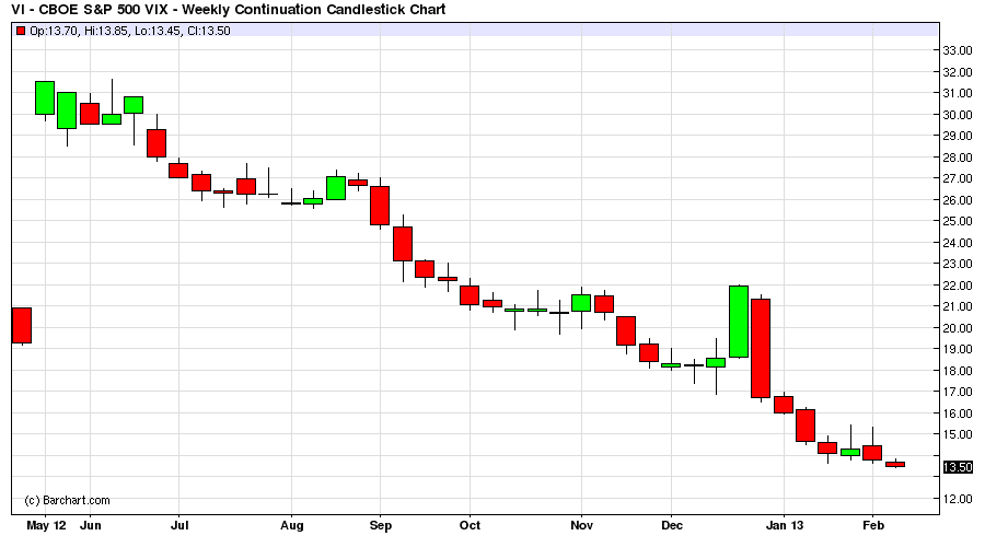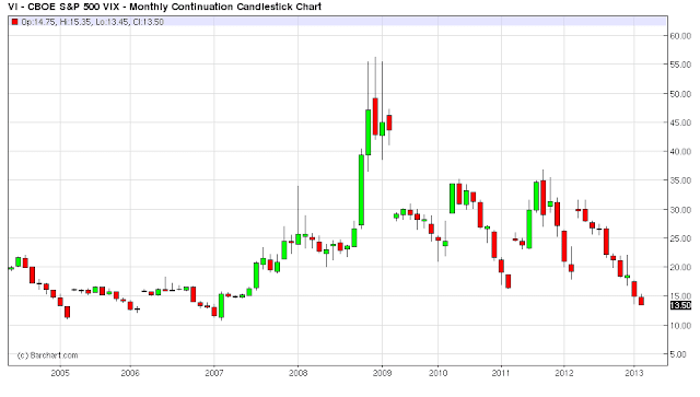 But longer term I envision a breaking of the $13.00 barrier some time in 2013, as the long-term downtrend in volatility is hard to miss, and very reminiscent of the bullish period before the epic collapse in financial markets.