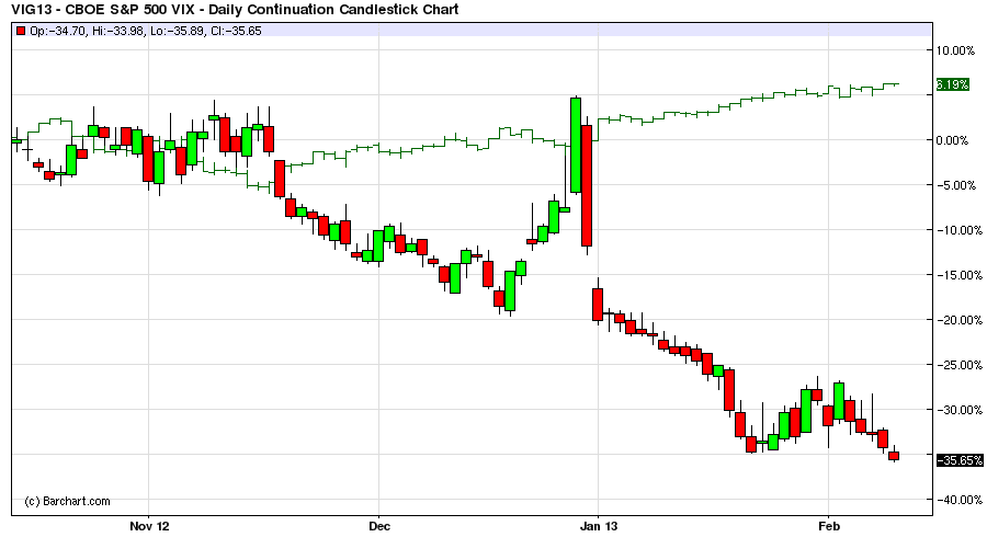 The VIX futures contract ends trading today, and the March VIX futures contract takes over. The first two months of the year have seen volatility crushed downward in this two month bullish rally in assets as new money came rushing into markets needing to get off to a positive start for the year.
