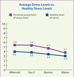 Both Millennials and Gen Xers report an average stress level of 5.4 on a 10-point scale where 1 is “little or no stress” and 10 is “a great deal of stress,” far higher than Boomers’ average stress level of 4.7 and Matures’ average stress level of 3.7.
