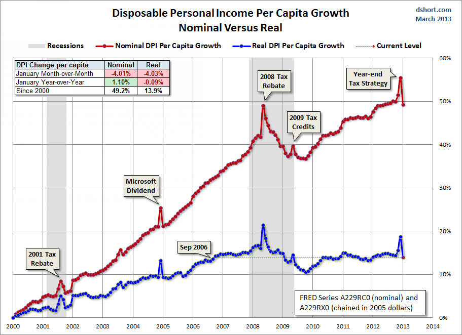 Instead of looking at wages, let’s consider real disposable income as a measure of the “wage recession”. Here is a chart from Doug Short at Advisor Perspectives on Nominal vs. Real Income.