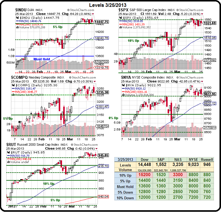 As you can see from our Big Chart, our premise that we're simply consolidating into the End of Quarter on Thursday remains sound with all of our 5% Rule levels holding up so far.  Bad news for the Bulls is that the S&P is having trouble with it's 7.5% line on the way up – and that's not a good thing.