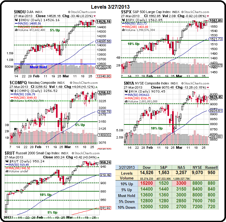 Still, our Big Chart keeps us from getting too bearish until we begin to fail all those lovely support lines that our indexes have masterfully held this week – no matter what negatives were thrown at them each day.  Our focus shorts, at the moment, are mostly in the energy sector as we think oil breaks after this weekend but, as I've noted since 3/7, it's the Dow that seems toppiest to us and we're ignoring today but we'll see if that 14,400 line holds up next week – that's the key line for the bulls.