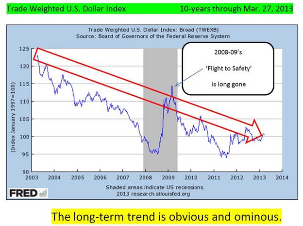 "The drop in the trade-weighted dollar came despite other countries’ attempts to ‘race to the bottom’ with their own currency units. QE programs from Chairman Bernanke are set to continue indefinitely. $85 billion a month equals a trillion a year of dilution. Smart money is chasing assets that can appreciate rather than wither."