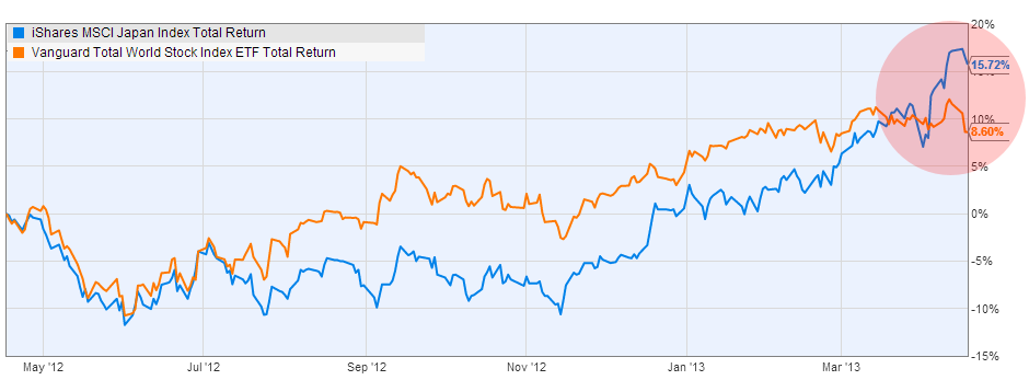 Moreover, it is clear from the nation's stock market performance relative to global equity markets (chart below) that currency wars can be quite effective and profitable if aggressively executed. Other nations (particularly in the region) are clearly watching and are likely to "retaliate" by devaluing their own currencies.