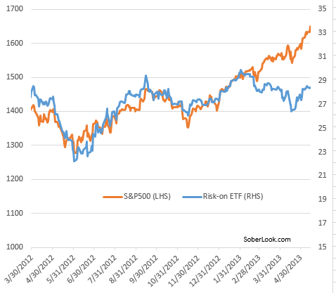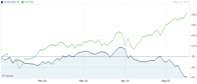 While the equity markets continued to march higher, other "risk-on" asset classes such as currencies and commodities have stumbled. The decoupling of the S&P500 index and the Australian Dollar (below) is a good example.