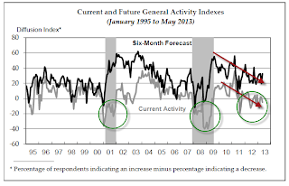 Note that manufacturers in the Philly region are especially clueless during recessions as to how fast things will improve. They can be wildly off at other times too, as shown by the black ovals.