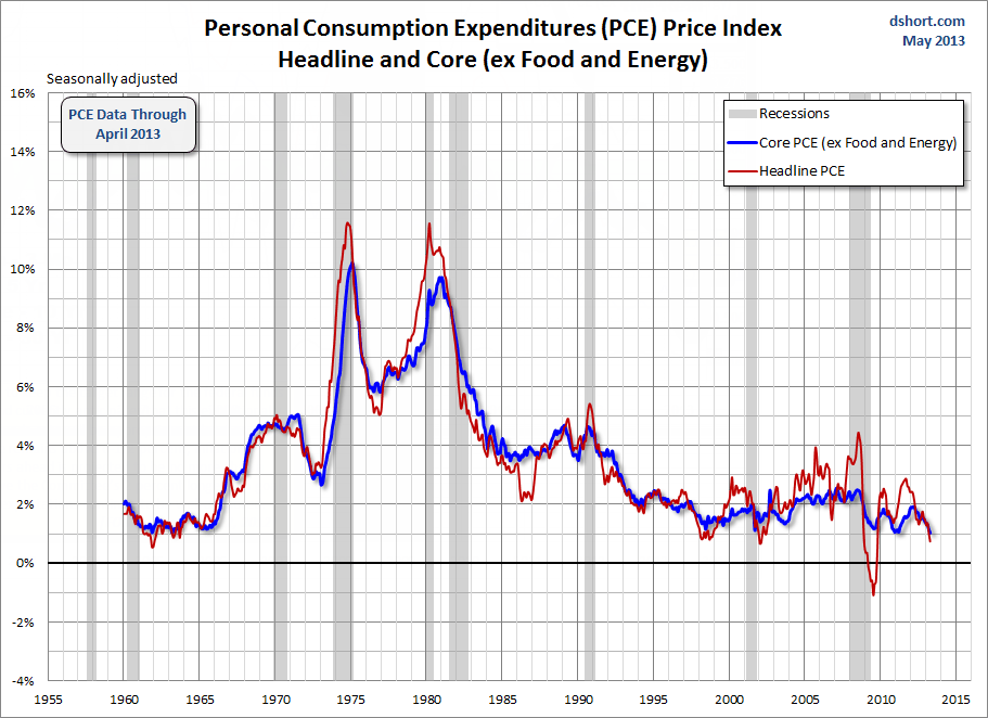 The continuing disinflationary trend in core PCE (the blue line in the charts below) must be troubling to the Fed. After years of ZIRP and waves of QE, this closely watched indicator has been consistently moving in the wrong direction for over a year. It has contracted month-over-month for ten of the last 13 months since its interim high of 1.96% in March of 2012 and is now approaching half that YoY rate.