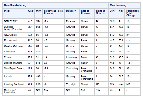 The June 2013 Non-Manufacturing ISM Report On Business® shows a slowing in NMI™ to 52.2%, well below the Bloomberg NMI consensus figure of 54.5%.