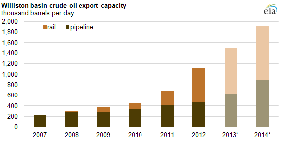 The North Dakota Pipeline Authority now estimates that 71% of the crude oil moved out of the Williston Basin was transported on rail cars while only 20% of it was carried in pipelines. Rising production and legislative gridlock on new pipelines means rail would have an increasing market share of transporting oil out of Williston basin.