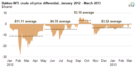 The lack of sufficient pipeline takeaway capacity was a major factor behind Bakken oil priced at a discount of $28 a barrel to NYMEX WTI in February 2012. Mind you that there’s also an additional WTI-to-Brent discount of up to $25/bbl at some point during 2012, owing largely again to the pipeline constraint leading to the oil glut at Cushing, OK, artificially depressing the price of NYMEX WTI.
