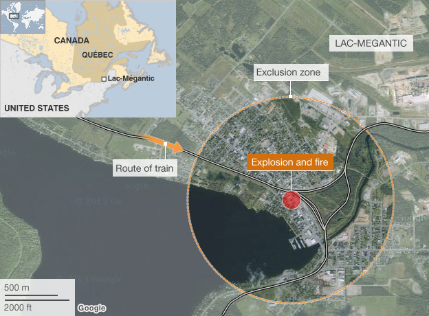 What ensued was described as “a war zone with multiple blasts came over a span of several hours” in the town of 6,000, which is about 155 miles east of Montreal and about 10 miles west of the Maine border. The latest news reported 13 dead, 50 missing, and crews are still working to contain 27,000 gallons of light crude that spilled from the tankers and possibly into a near-by river.