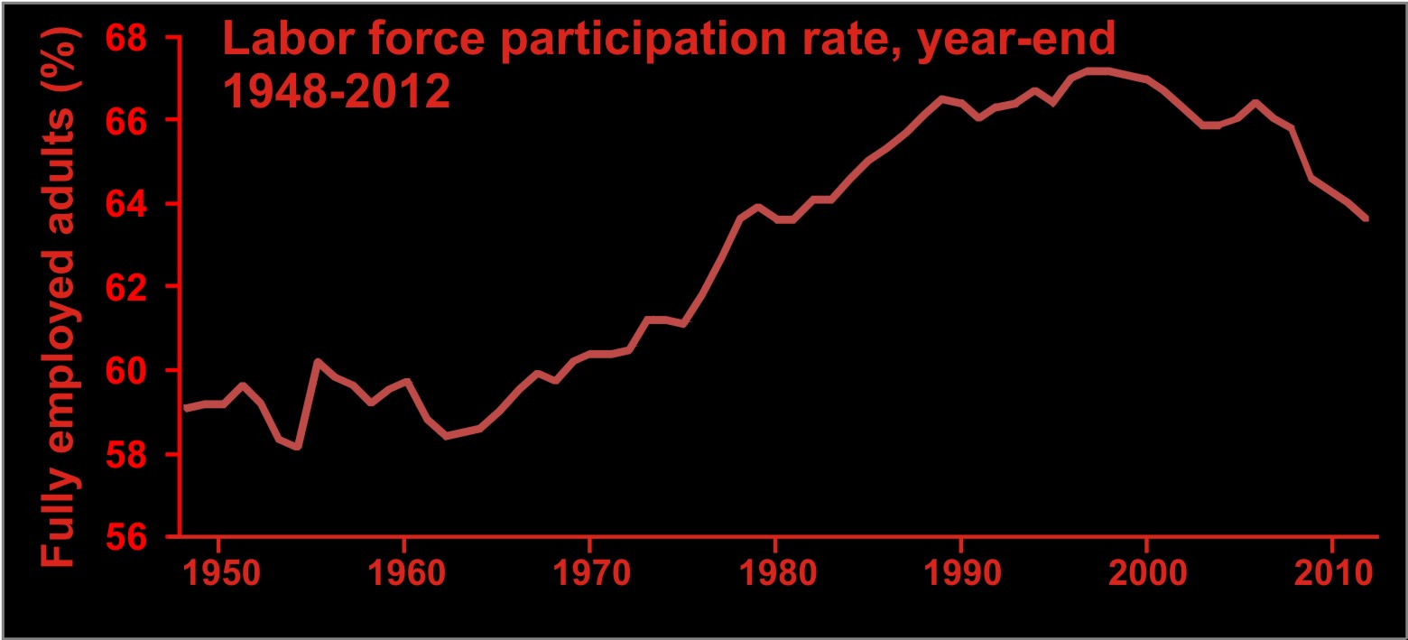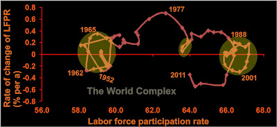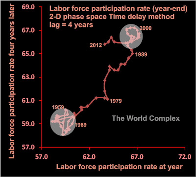 Pumping out money increased the labor force participation rate from about 59% in 1960 to 67% by about 2000 by creating jobs in military procurement, lobbying, and (as we went through successive bubbles) brokerages and finance, government, home construction, real estate sales, retail, etc. Now the losses in manufacturing and primary wealth creation are overwhelming the jobs created in the FIRE economy, and the US looks to be heading back to the golden era of the 50s, with labor force participation back below 60%. Too bad they'll all be low-paying jobs.