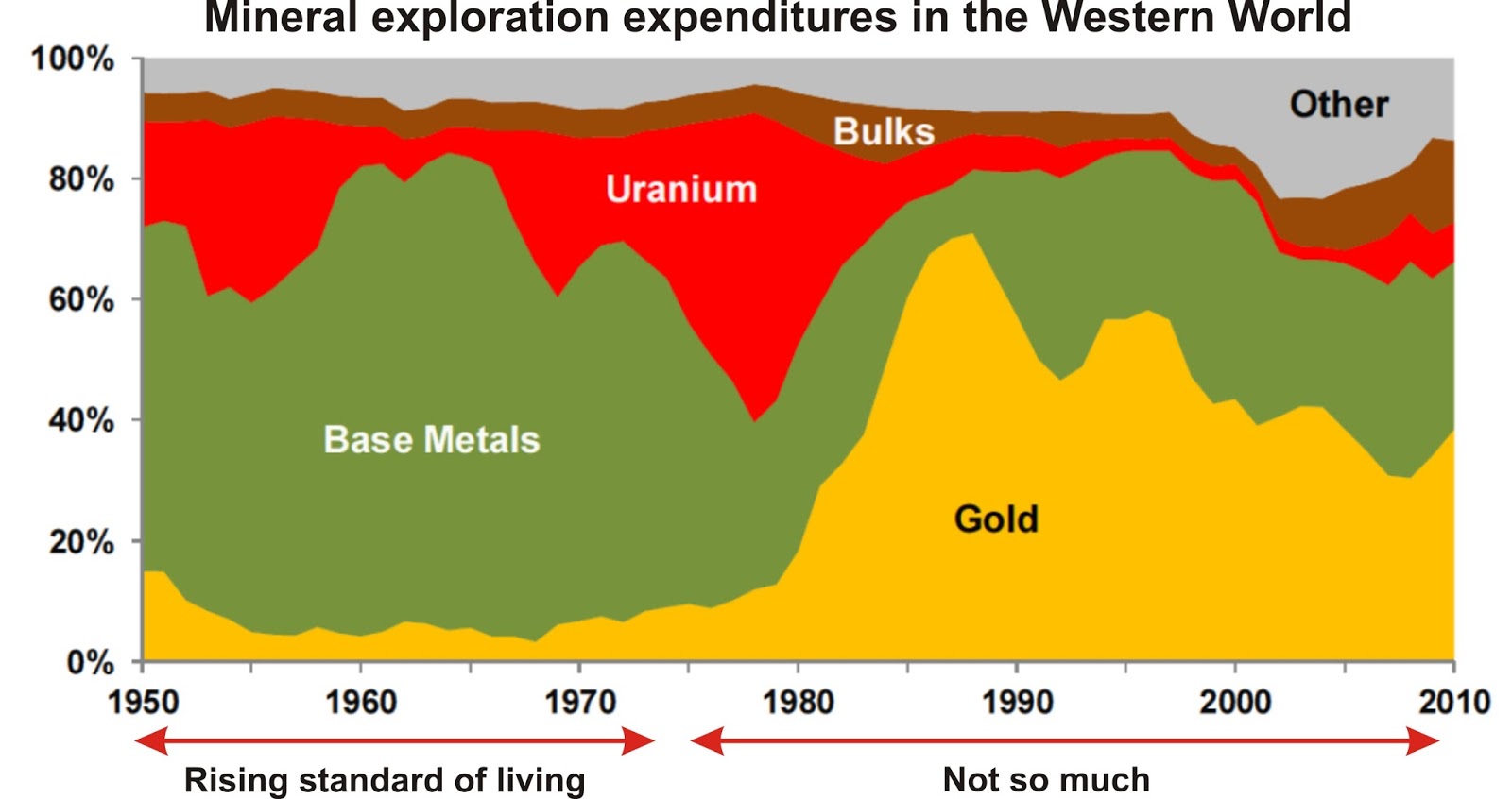 I think this graph shows the change in mindset from the past to the present. Don't mine base metals; mine money (gold). And this established the precedent for today's industrial ideal: don't make products, make money. And so the business model changed: from producing real products, which improved lives and increased the wealth of everyone; to making money through methods including outsourcing and speculation, which improved the lives and wealth of only a few.