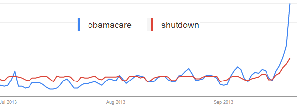 Whatever the case, a government shutdown that could result from this debate will not be helpful for job growth either. The good news is that the public is finally beginning to pay attention to the situation. The Google Trends search frequency for "Obamacare" and "Shutdown" have both risen in the past few days – although the shutdown risk may not be fully sinking in just yet.